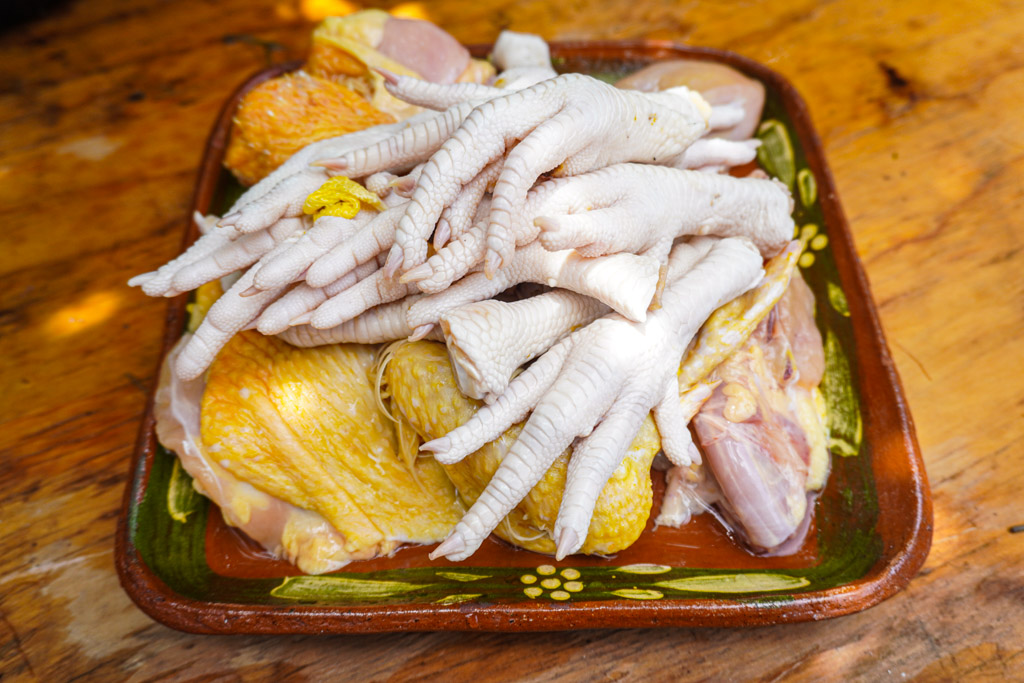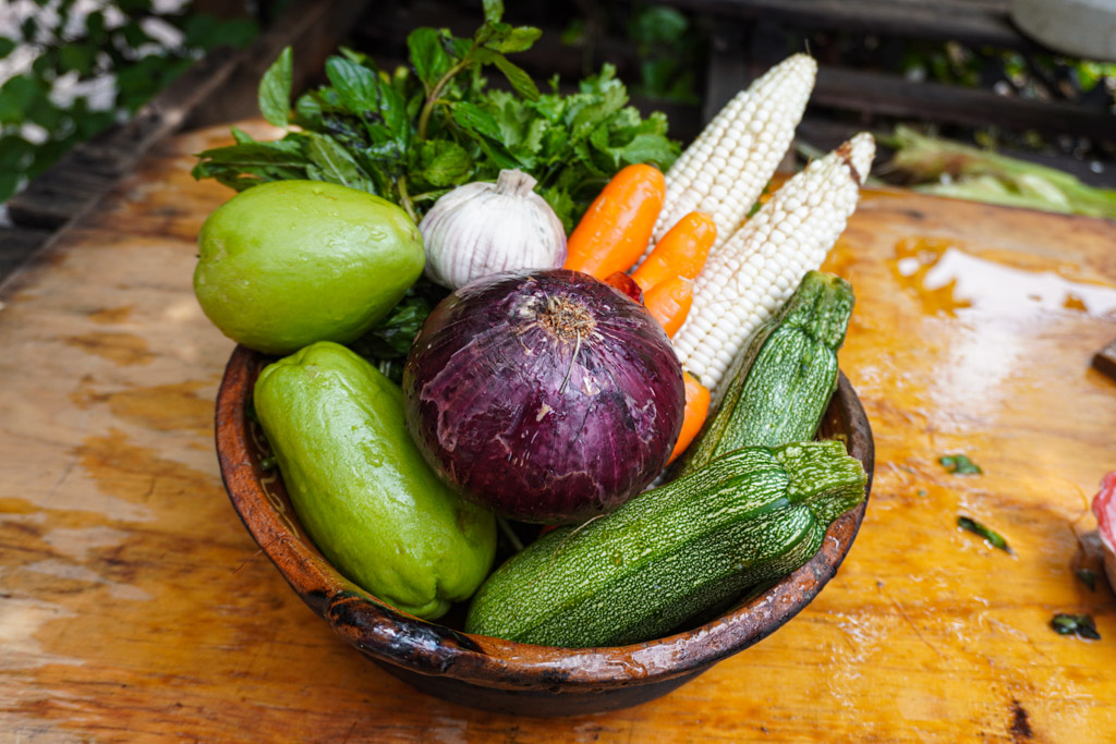 1. Prep Meat and Vegetables: Wash your chicken and pull any remaining feathers. Wash your onion, carrots, squash, corn, garlic, cilantro, and chayote.