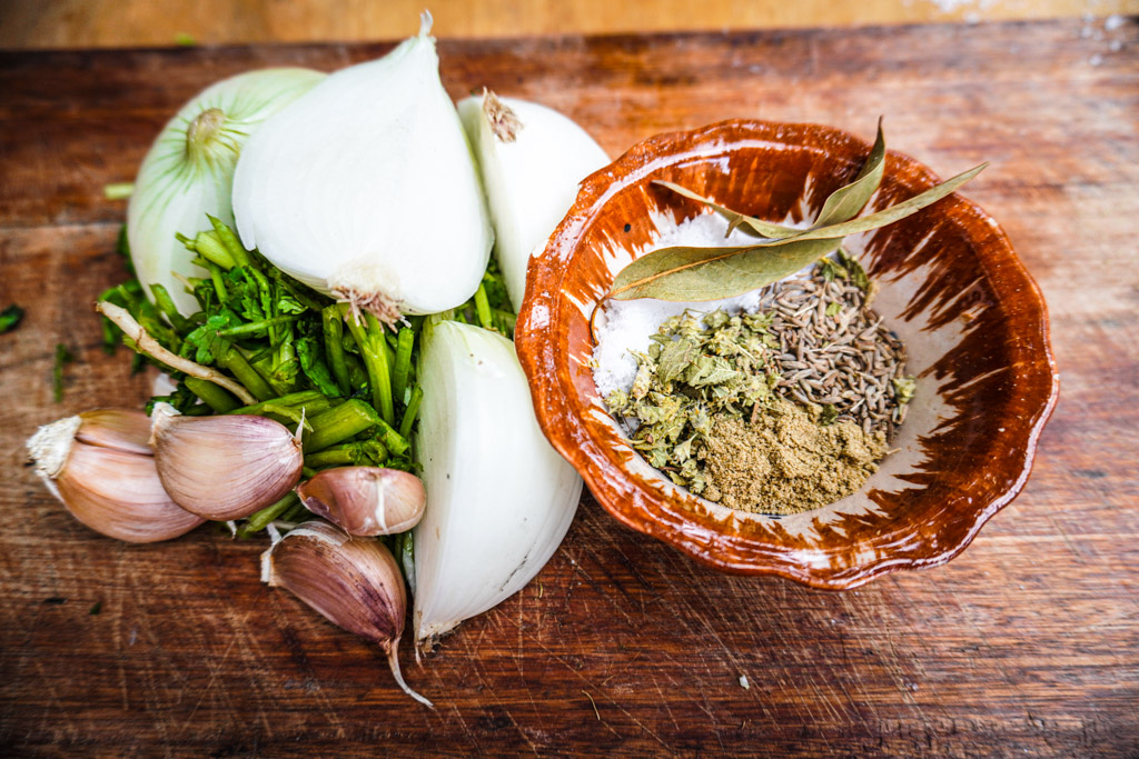 - Preparing the Meat: Wash your meat and then cut it down and throw into a pot of boiling water. Add a quartered onion, the bay leaves, cumin, black pepper, garlic and salt. Boil your Ancho and Guajillo chilis and a couple serranos or jalapenos in separate pot.